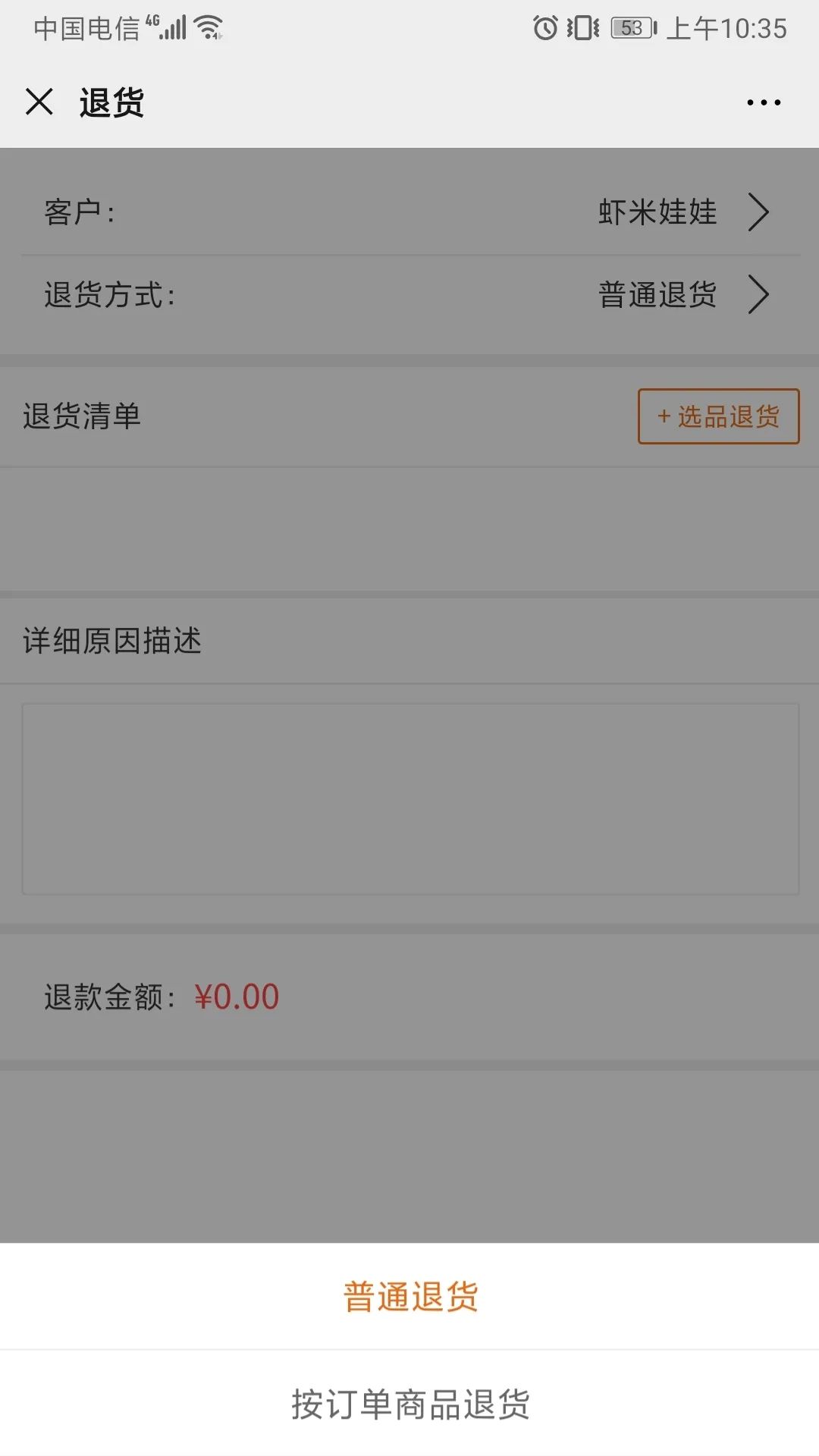 業(yè)務(wù)員可以在手機(jī)端為客戶辦理普通退貨或按訂單商品退貨,優(yōu)化業(yè)務(wù)員服務(wù)體驗(yàn)。