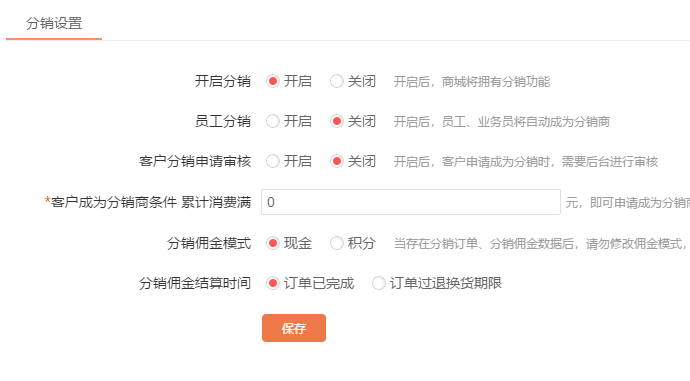 1、后臺(tái)可以開(kāi)啟或關(guān)閉分銷功能