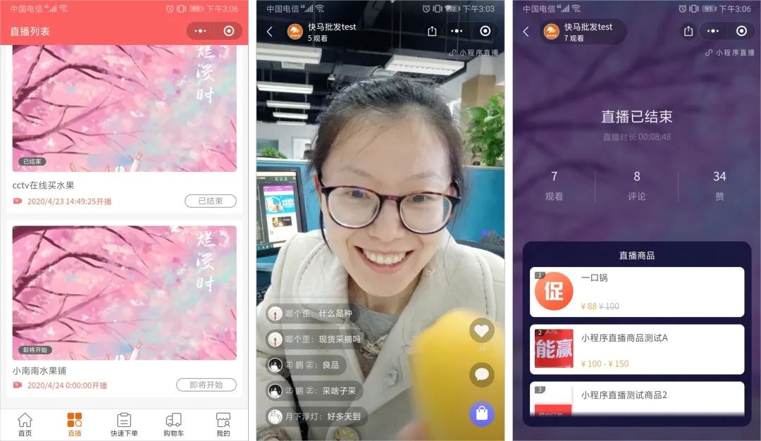 在小程序后臺(tái)可以創(chuàng)建直播,然后客戶在小程序端就能看到直播并互動(dòng),當(dāng)主播添加了推薦商品后,可以直接在線購(gòu)買,實(shí)現(xiàn)主播帶貨。