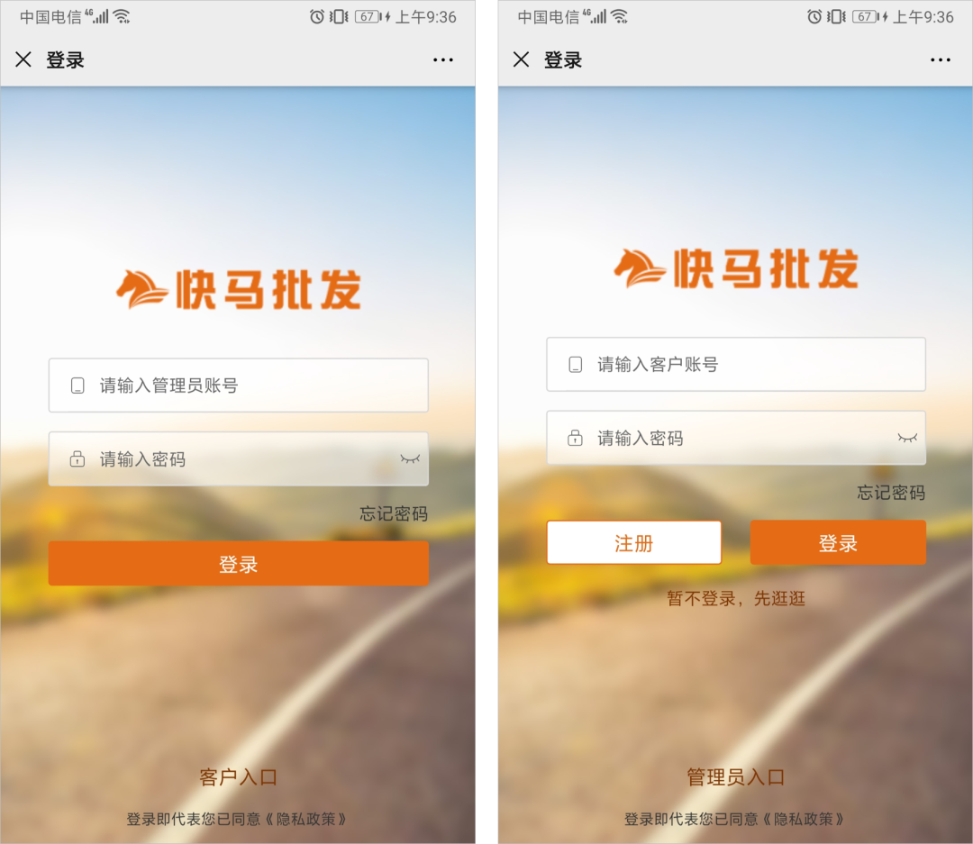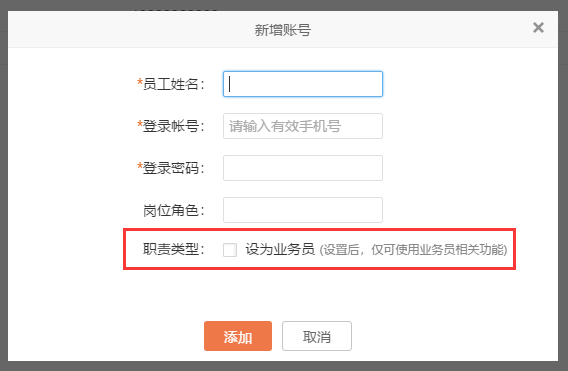 在后臺(tái)設(shè)置中,添加員工賬號(hào)時(shí),為其標(biāo)記為業(yè)務(wù)員后,該角色即創(chuàng)建成功。此后,所有端口管li員、業(yè)務(wù)員登錄端口統(tǒng)一,登錄操作不再做區(qū)分。不同身份在登錄界面切換“管li員/客戶”入口即可。并且此后不再有快馬pi發(fā)APP,快馬業(yè)務(wù)員APP,統(tǒng)一為一個(gè)快馬APP。
