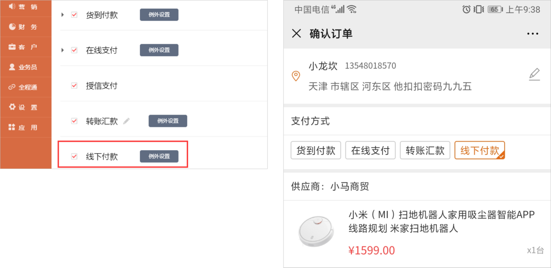 線下付款功能同樣支持例外設(shè)置,配置以后,客戶下單結(jié)算時(shí)即可選擇線下付款。
