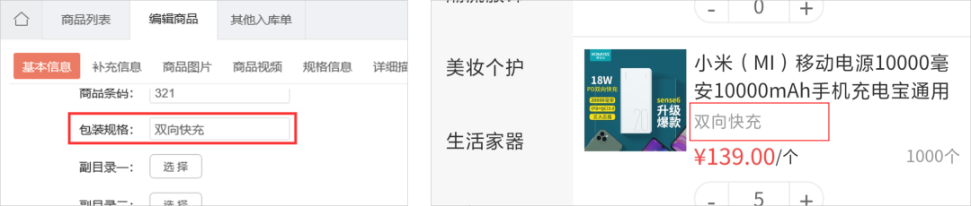 支持商品編輯字段【包裝規(guī)格】,展示在前端商品列表頁(yè)。