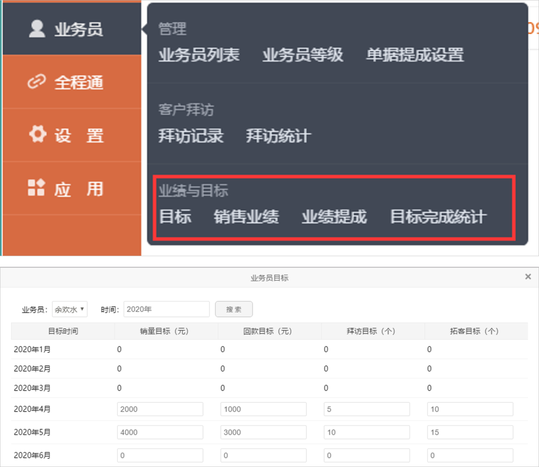 可以在后臺(tái)為業(yè)務(wù)員設(shè)置銷售、回款、拜訪、拓客目標(biāo),后臺(tái)統(tǒng)計(jì)表和業(yè)務(wù)員端自動(dòng)納入統(tǒng)計(jì),生成對(duì)應(yīng)數(shù)據(jù)。