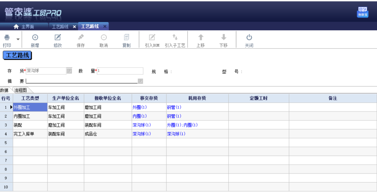 建立客戶化工藝流轉(zhuǎn)單:初步看到此工藝流程有些可能會(huì)覺得復(fù)雜繁瑣,其實(shí)在工貿(mào)PRO中建立起來很簡單,工貿(mào)Pro中的折疊工序概念很好地管理了這一點(diǎn);例如把外圈加工需要的工種:粗車第一面粗車外內(nèi)徑、粗車第二面粗車外徑、軟磨平面、軟膜外徑、細(xì)車外內(nèi)徑車兩面內(nèi)外倒角、粗車外溝道、細(xì)車外溝道、車溝邊角,統(tǒng)一命名為外圈加工;