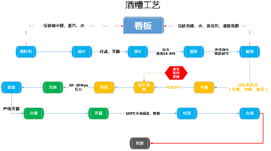 原材料管理:庫管員采購原材料入庫,原料處理;目的:釀造用水需經(jīng)過濾、滅菌等處理,使之符合生活飲用水衛(wèi)生標(biāo)準(zhǔn)。糯米先經(jīng)過挑選,除去沙石等異物,再用水沖洗后浸泡 16~24h,用手指掐米粒成粉狀無硬心即可 ;