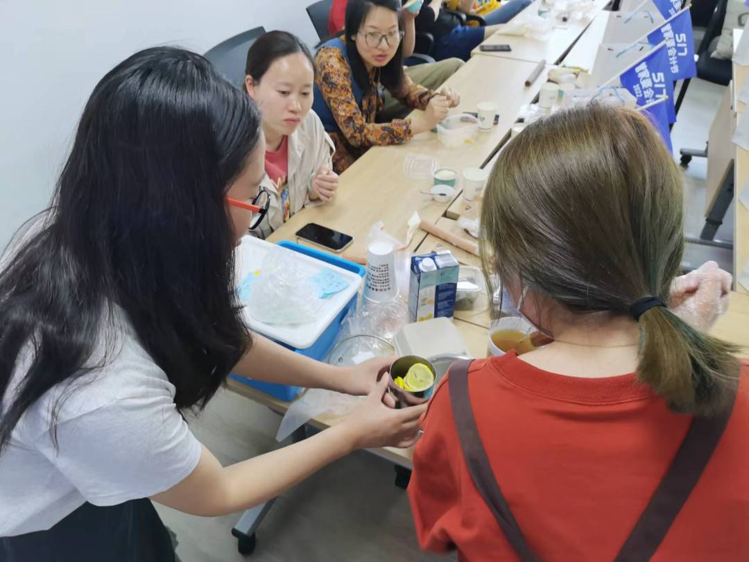 活動開始前,我們已經(jīng)提前備好了雪媚娘和玫瑰芋圓所有的食材和工具。活動現(xiàn)場,甜品老師細致地介紹了制作步驟,我們的會計小姐姐們也跟著一起手動制作雪媚娘。