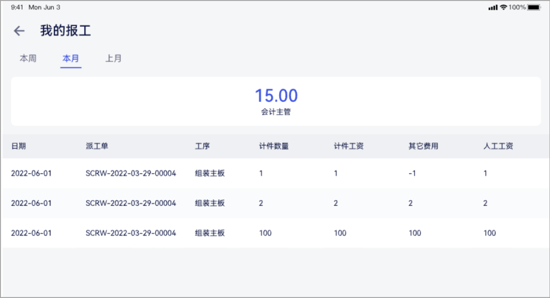 我的頁(yè)面中,增加我的報(bào)工查看,可查看操作員本周、本月以及上月的計(jì)件工資,同時(shí)可查詢計(jì)件工資的組成明細(xì)。
