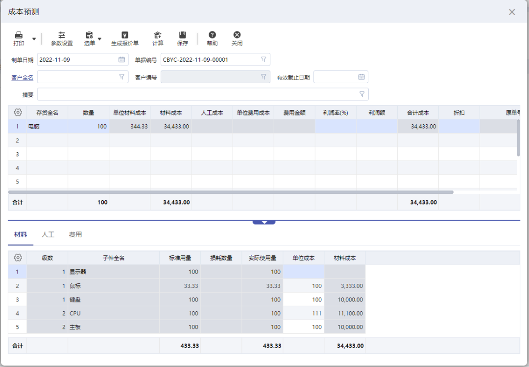 ① 材料:從BOM中獲取組件材料,單位成本根據(jù)成本獲取方式取得,也可以手動調(diào)整;