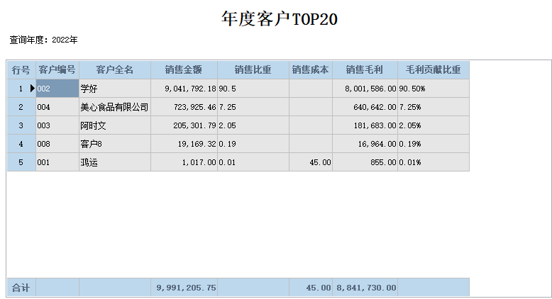 企業(yè)管理者想知道哪些客戶是企業(yè)目前的頭等客戶?如何快速統(tǒng)計企業(yè)頭等客戶?【經(jīng)營助手】從客戶的拿貨金額入手,首先分析出年度前20名的客戶,然后再統(tǒng)計出這些客戶的銷售比重、成本、毛利,分析出毛利貢獻(xiàn)占比,根據(jù)分析得到的結(jié)果,安排相關(guān)業(yè)務(wù)員針對這些客戶做更好的維護(hù)。
