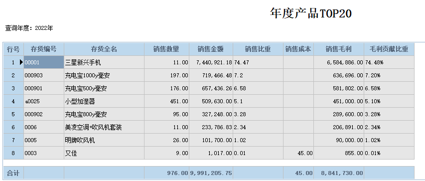 企業(yè)管理者想知道企業(yè)今年有哪些賣的好的產(chǎn)品?如何快速統(tǒng)計企業(yè)暢銷產(chǎn)品?【經(jīng)營助手】從產(chǎn)品的銷售數(shù)量和金額入手,首先分析出年度前20名的產(chǎn)品,然后再統(tǒng)計出這些產(chǎn)品的銷售比重、成本、毛利,分析出毛利貢獻(xiàn)比重,根據(jù)分析得到的結(jié)果,對于銷售好的產(chǎn)品大力推廣,開拓更多客戶拿貨,打造爆品。